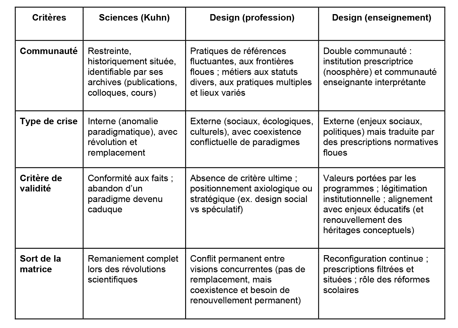 Ce tableau met en évidence les limites de l'analogie kuhnienne. Là où la science obéit à des critères épistémologiques internes, le design professionnel, hétérogène, est traversé par des conflits axiologiques. Quant à l'enseignement du design, il constitue un espace prescriptif où objectifs scolaires, contraintes institutionnelles et héritages culturels reconfigurent en permanence les composantes de la matrice.