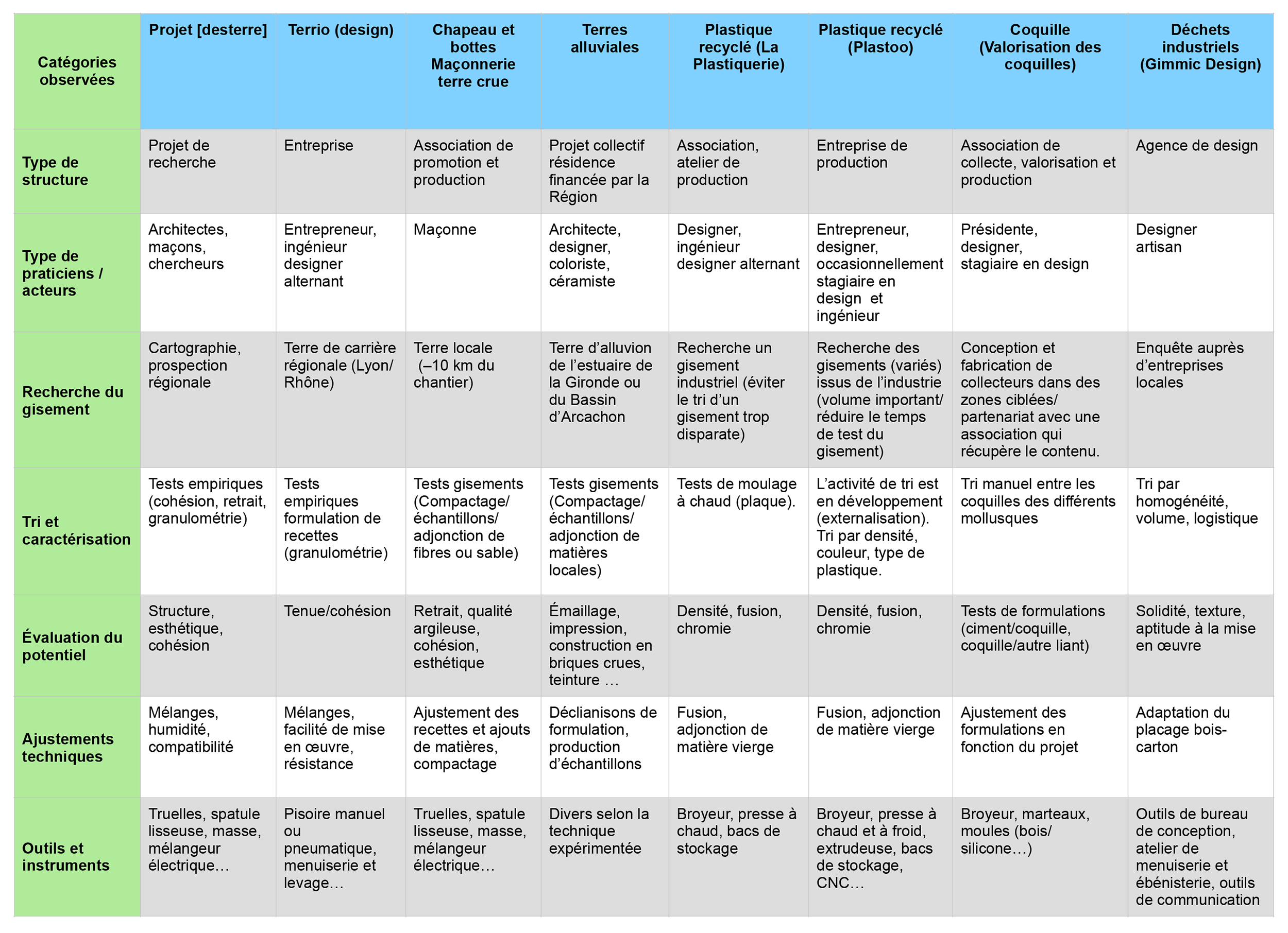 Nos observations ont été réalisées sur une quinzaine de terrains de pratique (ateliers, entreprises locales, structures associatives, tiers-lieux et workshops) dédiés à l'expérimentation de matériaux biosourcés ou de déchets industriels, recyclés ou réemployés. Ces données ont été recueillies à partir d'observations participantes, de comptes rendus de projets étudiants et d'entretiens informels avec les praticiens impliqués. L'analyse se fonde sur une grille inductive construite a posteriori, distinguant les gestes, les milieux, les outils, puis les valeurs et modèles récurrents observés. Cette approche vise moins à établir une typologie exhaustive qu'à identifier des régularités transversales susceptibles d'indiquer l'évolution des matrices pratiques du design contemporain. Les pratiques observées dans certaines filières dont la terre crue (brique/pisé) ou du plastique recyclé montrent la constitution progressive d'un champ d'action commun, caractérisé par une série d'activités récurrentes d'un milieu pratique à un autre comprenant des phases relativement similaires, malgré la disparité des structures qui recourent au design. Selon les cas, le designer peut diriger l'entreprise ou n'être qu'un membre du projet. Il participe néanmoins toujours à ces étapes (recherches de gisement, tri, préprojet...), car il est au moins conseillé du chef d'entreprise en tant que concepteur, et souvent plus expert en matière de techniques de mise en œuvre.